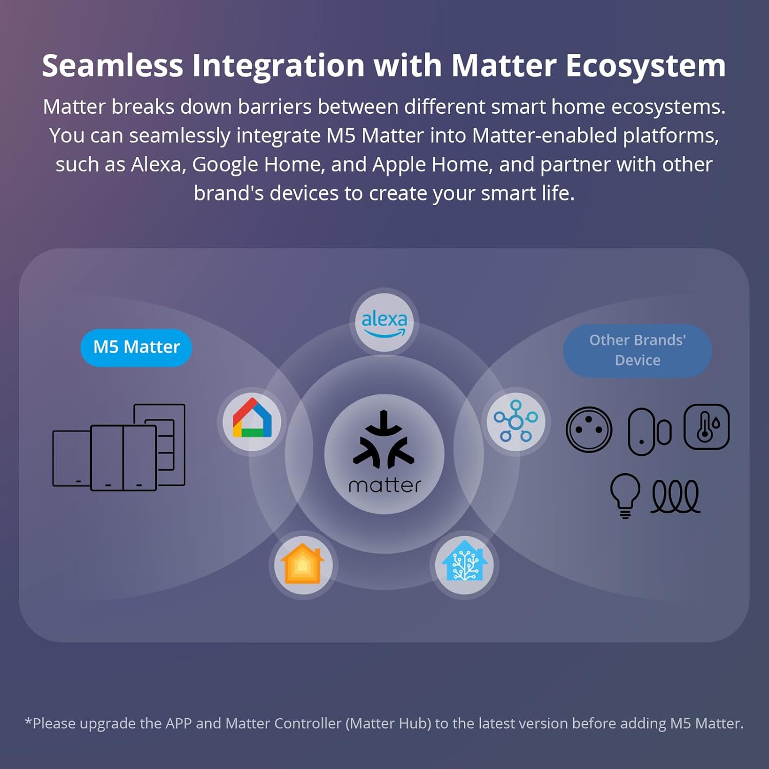 Der Schalter ist Matter-fähig und funktioniert in Home Assistant, Apple Home, Alexa und Google Home. Über Home Assistant kann er auch mit Geräten anderer Technologien in gemeinsamen Automationen genutzt werden (z. B. Lampen, Sensoren oder Aktoren anderer Funkstandards).